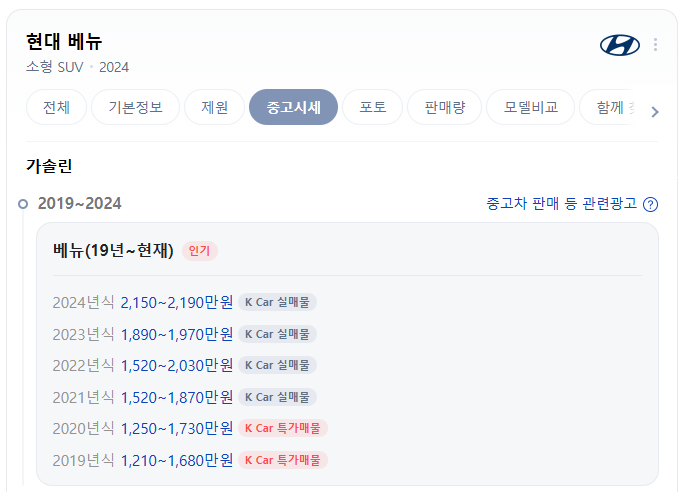 중고차 시장에서 베뉴는 수요가 높은 편입니다.