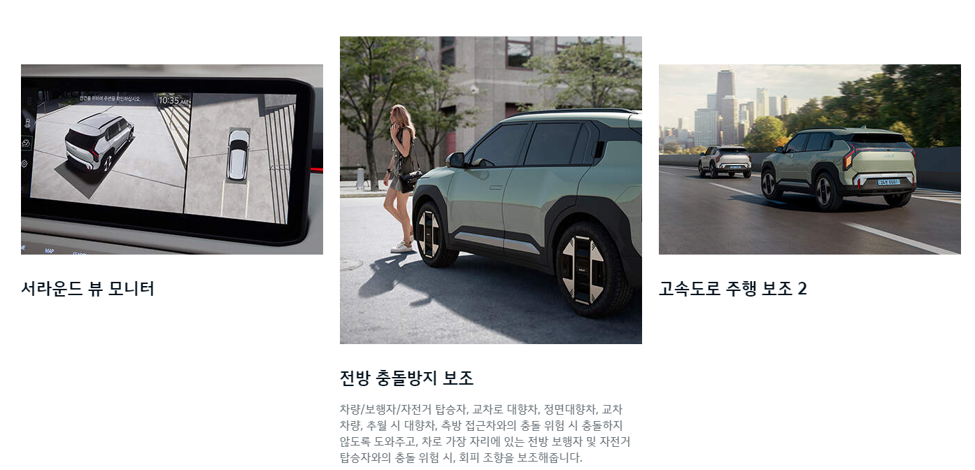 EV3는 전기차의 미래 지향적인 디자인을 갖추고 있습니다. 외관은 세련되고 현대적인 느낌을 주며, 내부는 사용자 중심의 편의 기능이 가득합니다. 다양한 스마트 기능이 탑재되어 운전의 편리함을 높여주며, 대화면 디스플레이와 최신 인포테인먼트 시스템도 적용되어 있습니다. 전반적으로 EV3는 스타일과 편의성을 모두 갖춘 차량이라 할 수 있습니다.
